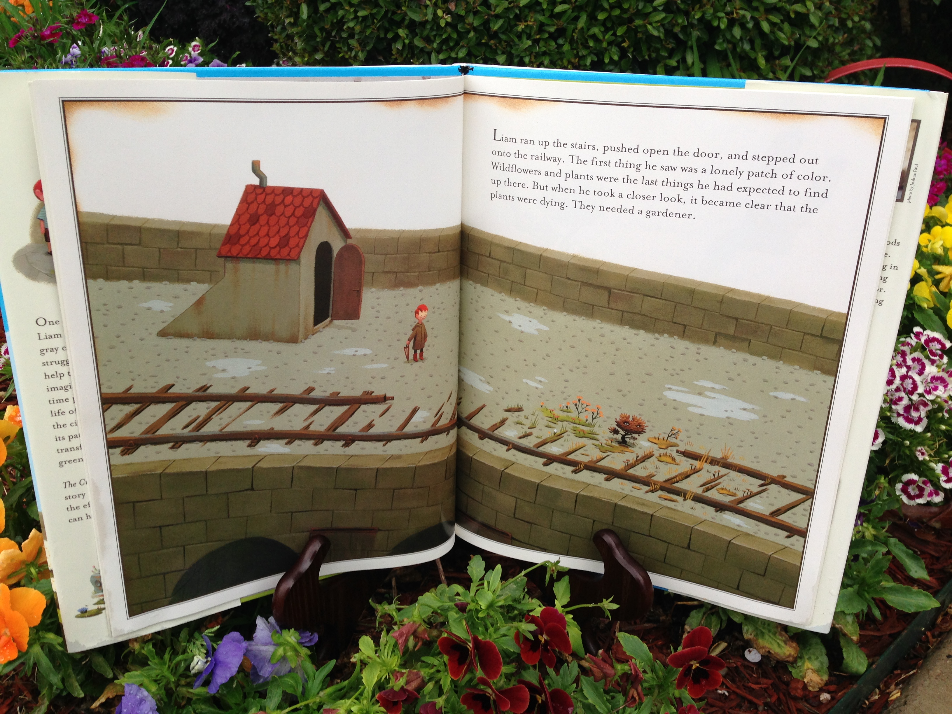 Liam lived in a dreary town “without gardens or trees or greenery of any kind.” In spite of the dreariness, he loved being outdoors. One morning while wandering through his neighborhood, happily splashing in the rain puddles, he discovered a stairwell leading up to abandoned railway tracks. When he reached the top and stepped onto the broken down railway, he saw what he least expected: wildflowers and plants. Without being tended, the flowers were dying, and Liam saw that they needed a gardener. Although he didn’t fit that title, he was willing to try to help. This is the spot where it all began.
