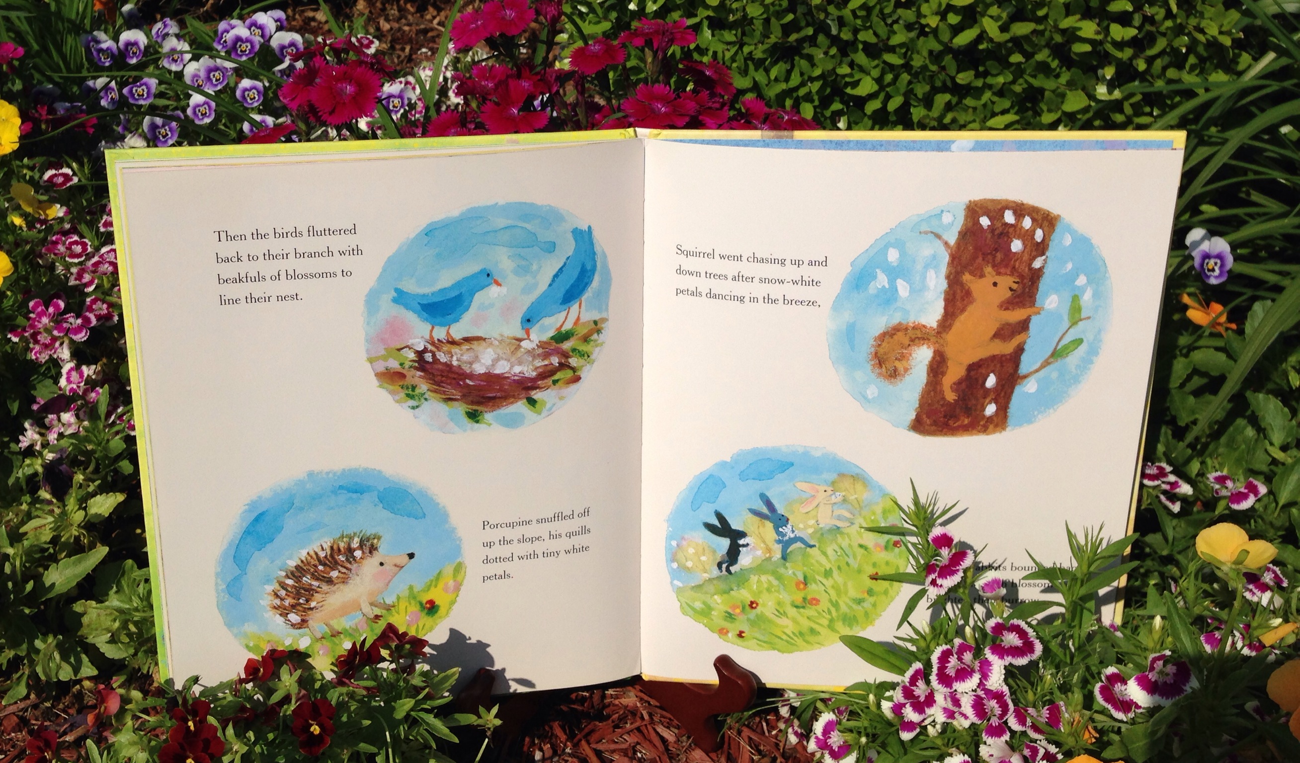 Yet, they could not resist delaying their work for just a bit to go and see the snow for themselves and play! “So the rabbits hoppity-roly-poly-plopped down the hill, through the woods” with all the friends following. Fletcher was right. The ground was covered in white, but not white snow,white BLOSSOMS!