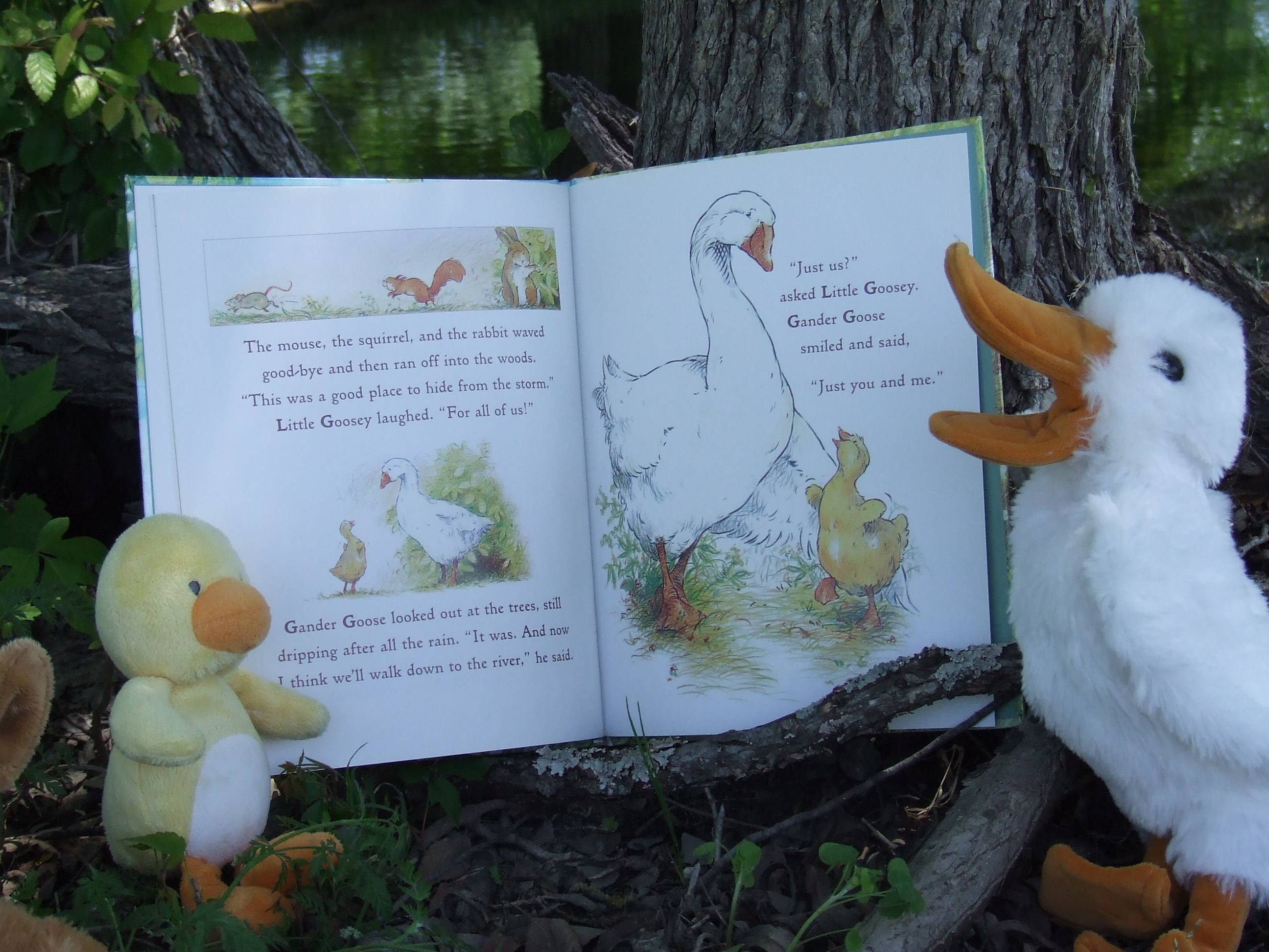 “One day Little Goosey and Big Gander Goose, who looked after her, set out to walk down to the river.” When a storm comes upon them and threatens their enjoyable time together, they divert their walk to begin looking for a place to hide.
