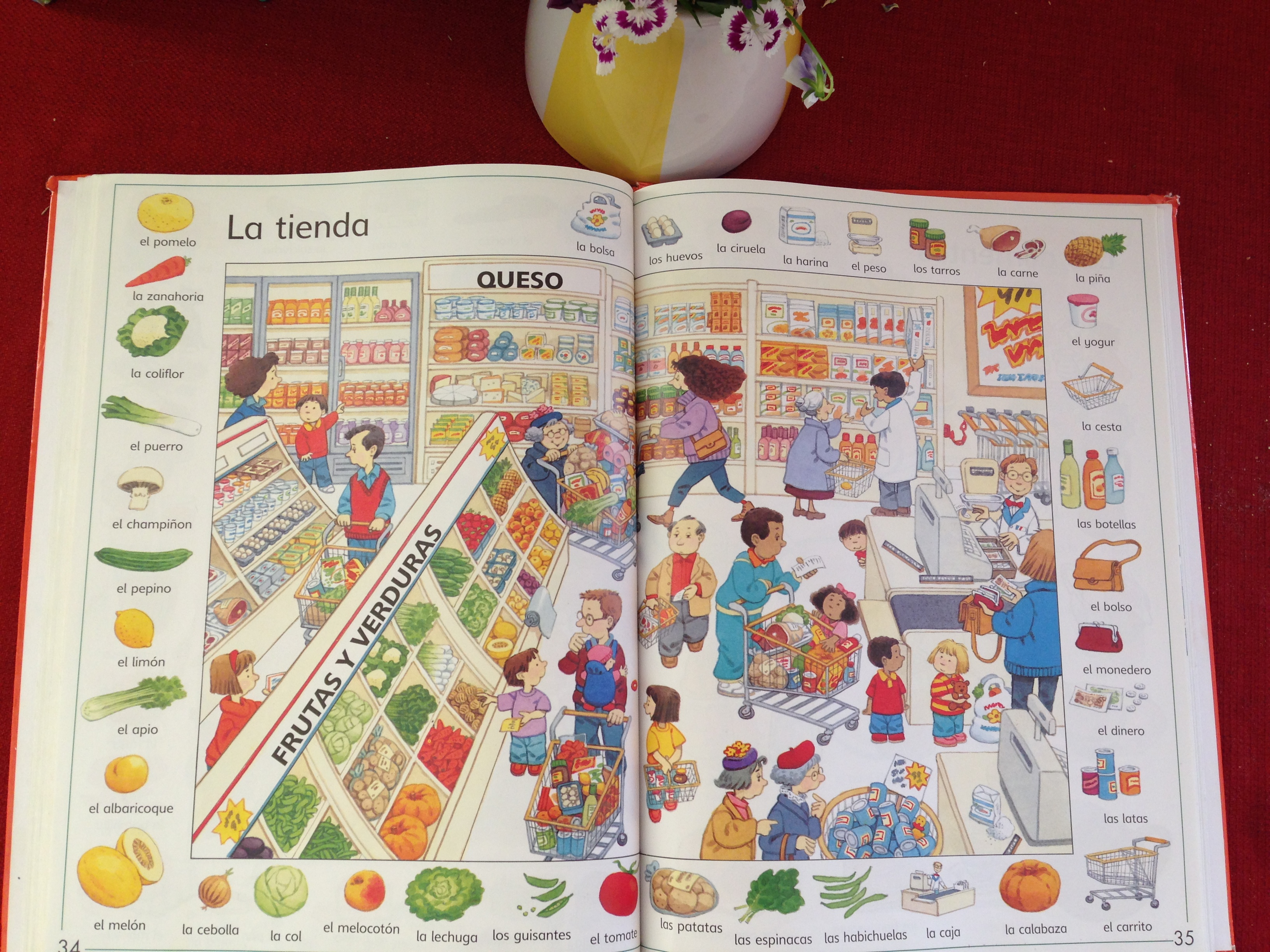 The next level, First Thousand Words in Spanish is organized into categories too with only the Spanish label under the picture. The great part about this book is that there’s an internet-linked pronunciation guide to help readers!