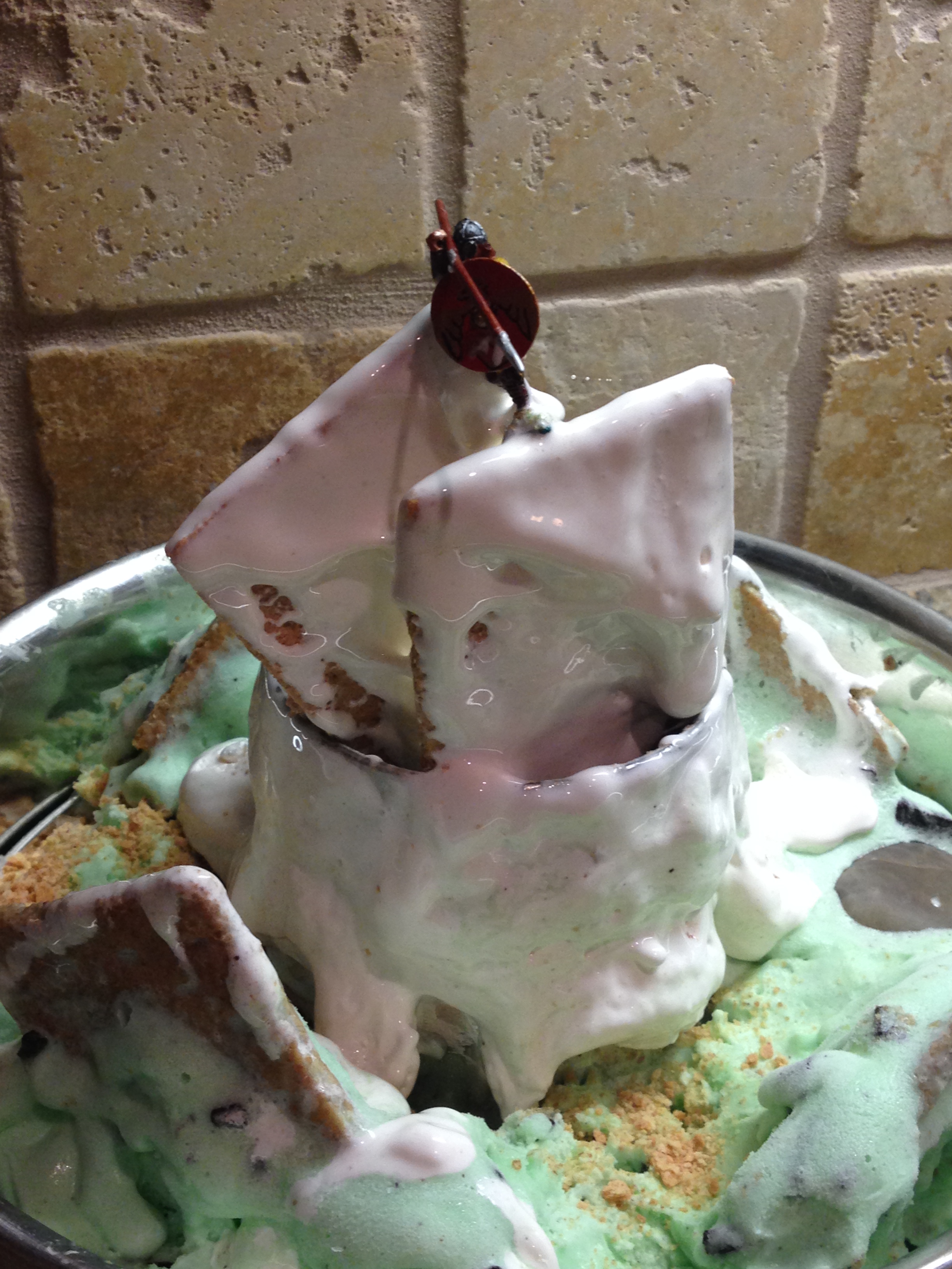 My husband just returned from Scotland where he hiked the Highlands for over 10 hours. We welcomed him home with an interesting dessert: Mint-Chocolate Chip Mountains with Marshmallow Cream Snow Tops, Graham Cracker Crumb Paths, and Star Marshmallow Sky.