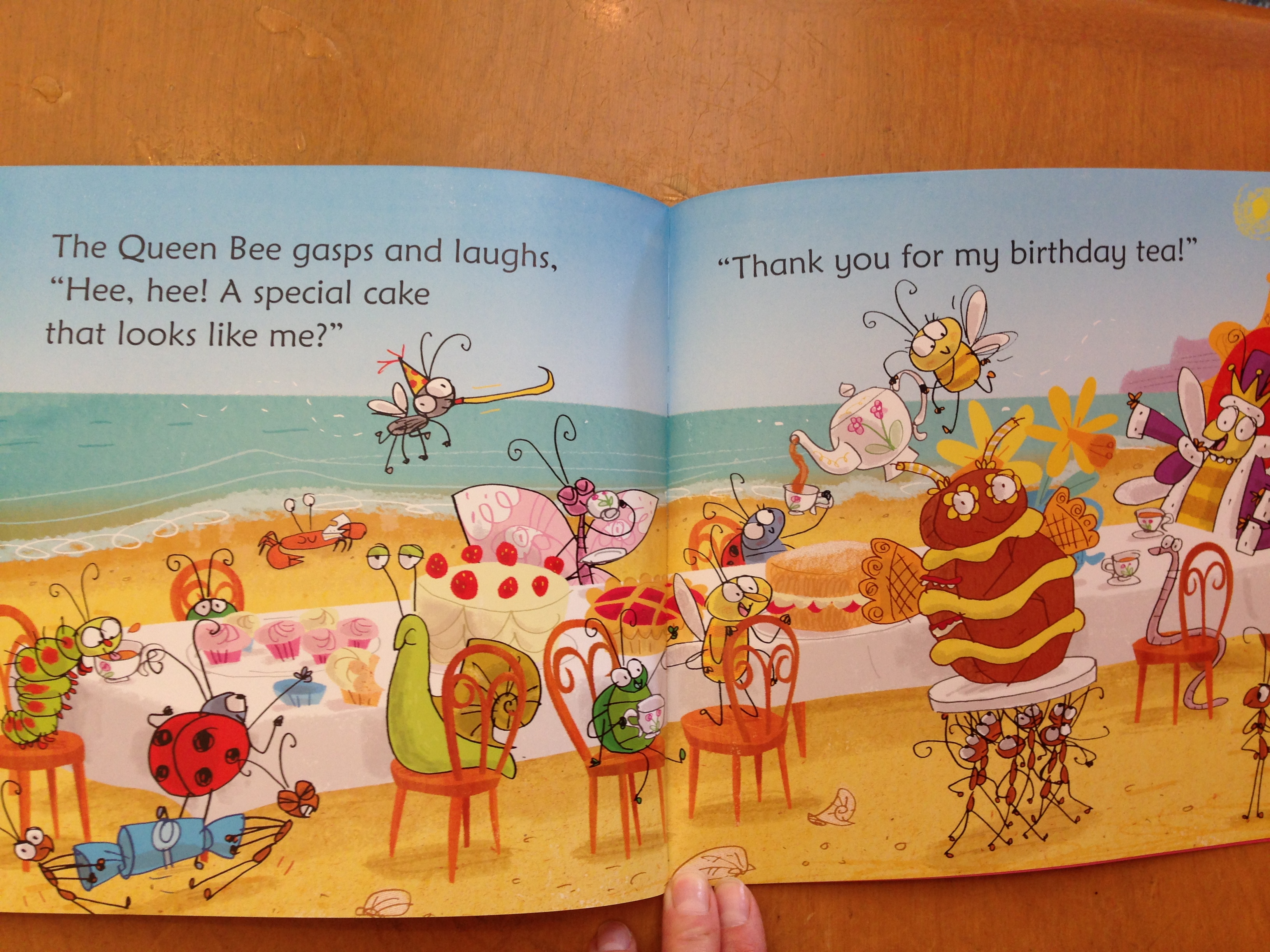 “The Queen Bee gasps and laughs,’Hee, hee! A special cake that looks like me?