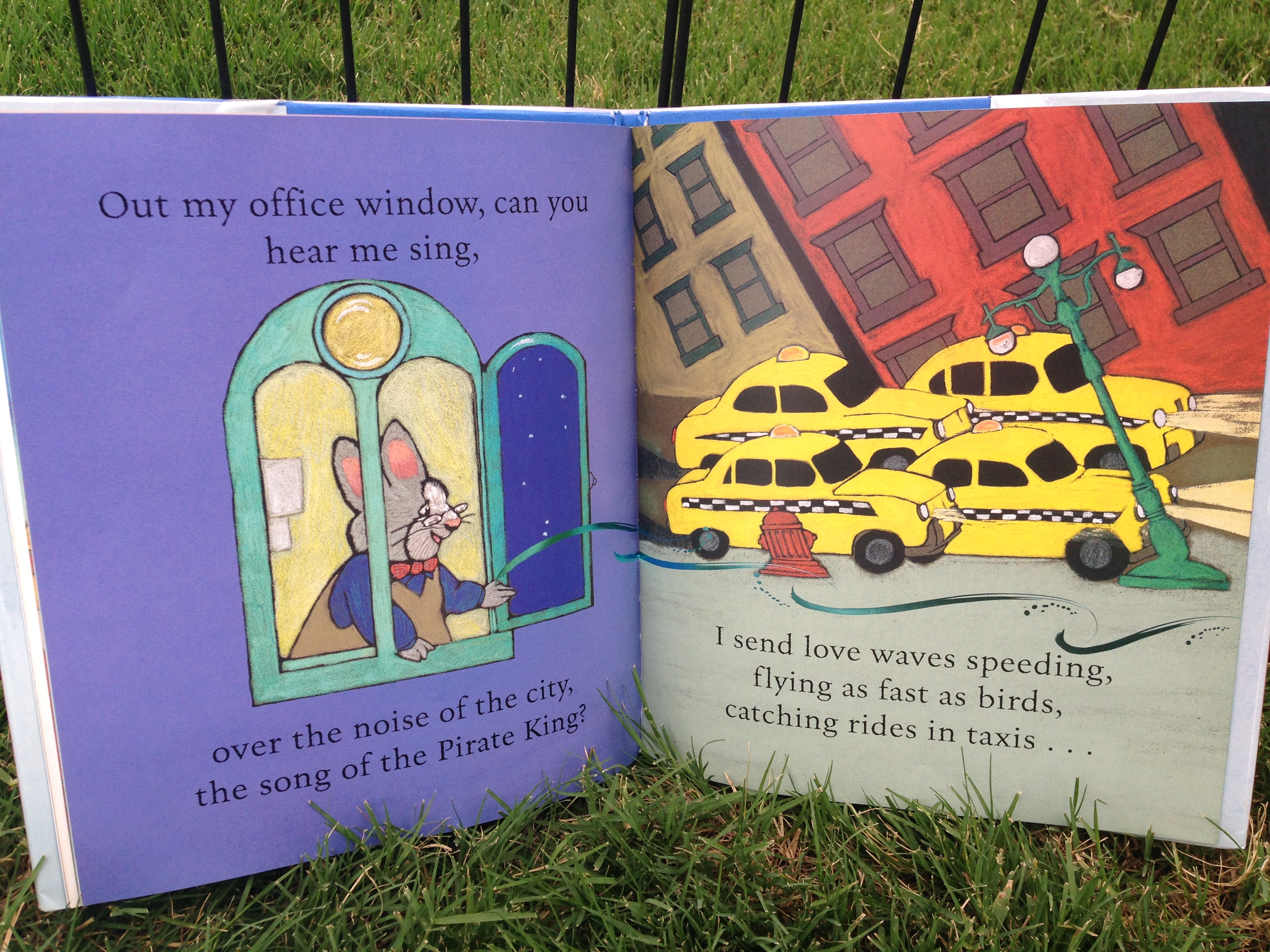 When she returns, Daddy goes to work. When he answers his office phone, he hopes it’s Little Bunny calling to tell him what he’s doing: trying to button his shirt, trying to tie his shoe? From his office window, he sends “love waves” over the city to his son.