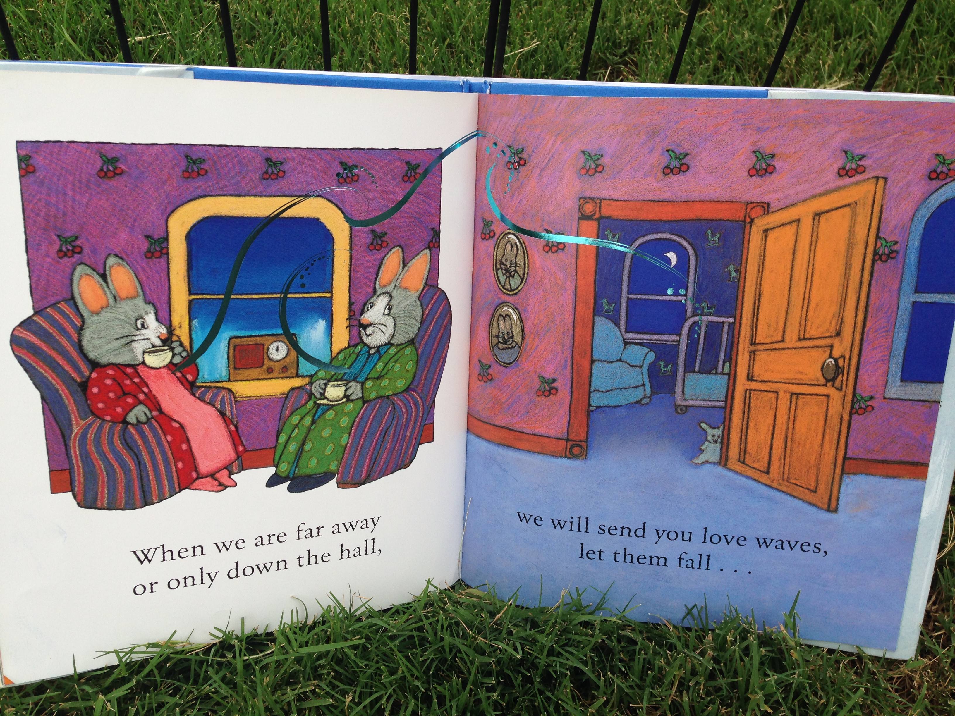 When Mommy and Daddy take turns going to their jobs, Little Bunny misses the parent that needs to be gone for a while. His parents miss him too! While at work, Mommy wonders what he’s doing at home: zooming in his race car, swinging high above the trees, eating honey with his peas? As she thinks of him, she sends “love waves” to him until she can get home.