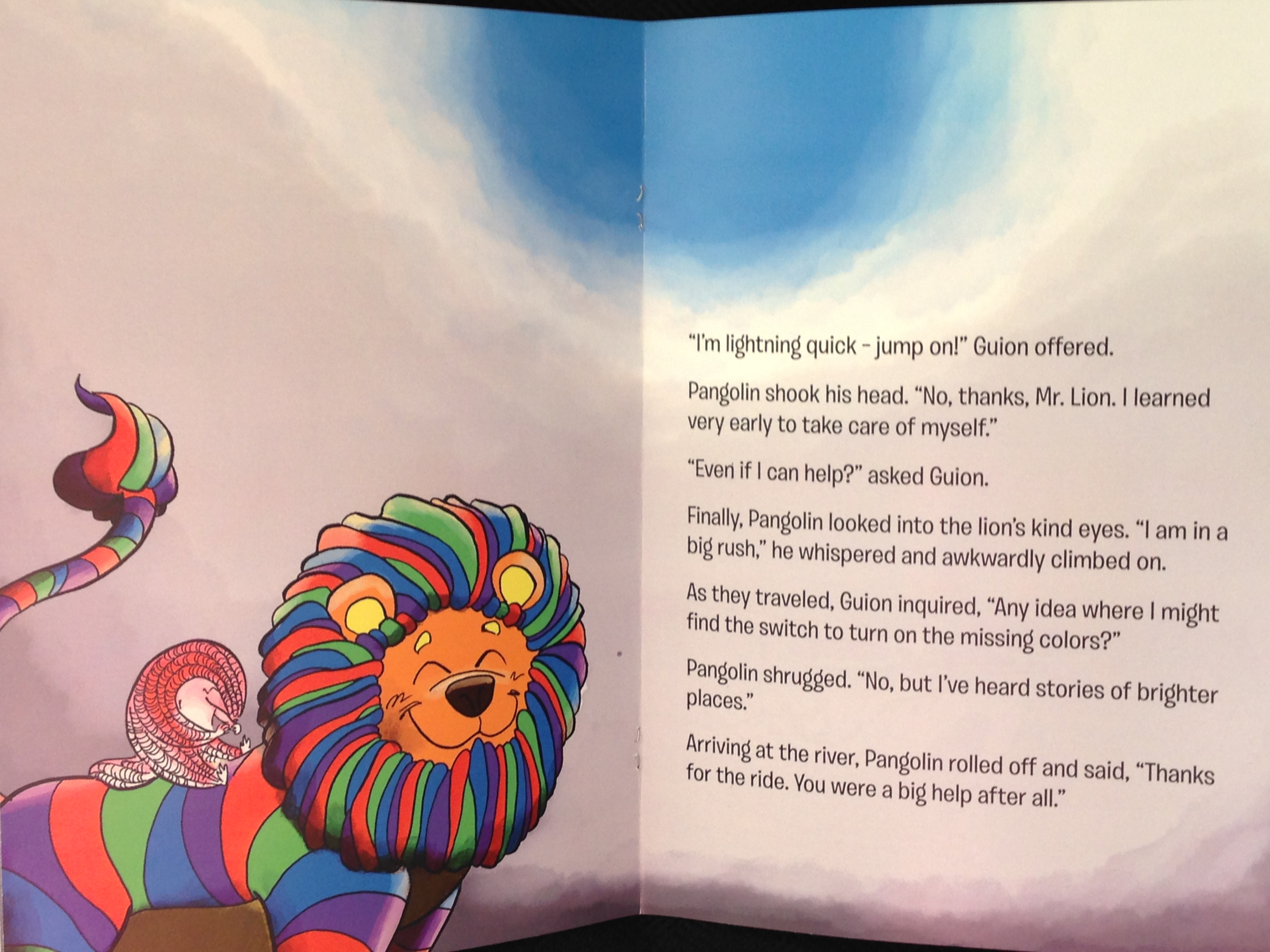 Next he meets Pangolin who is in a rush to go to the river. Hesitant at first to accept Guion’s help, Pangolin looks at the lion’s kind eyes, and then jumps onto his colorful back. Again, Guion’s color begins to overflow onto this creature too.