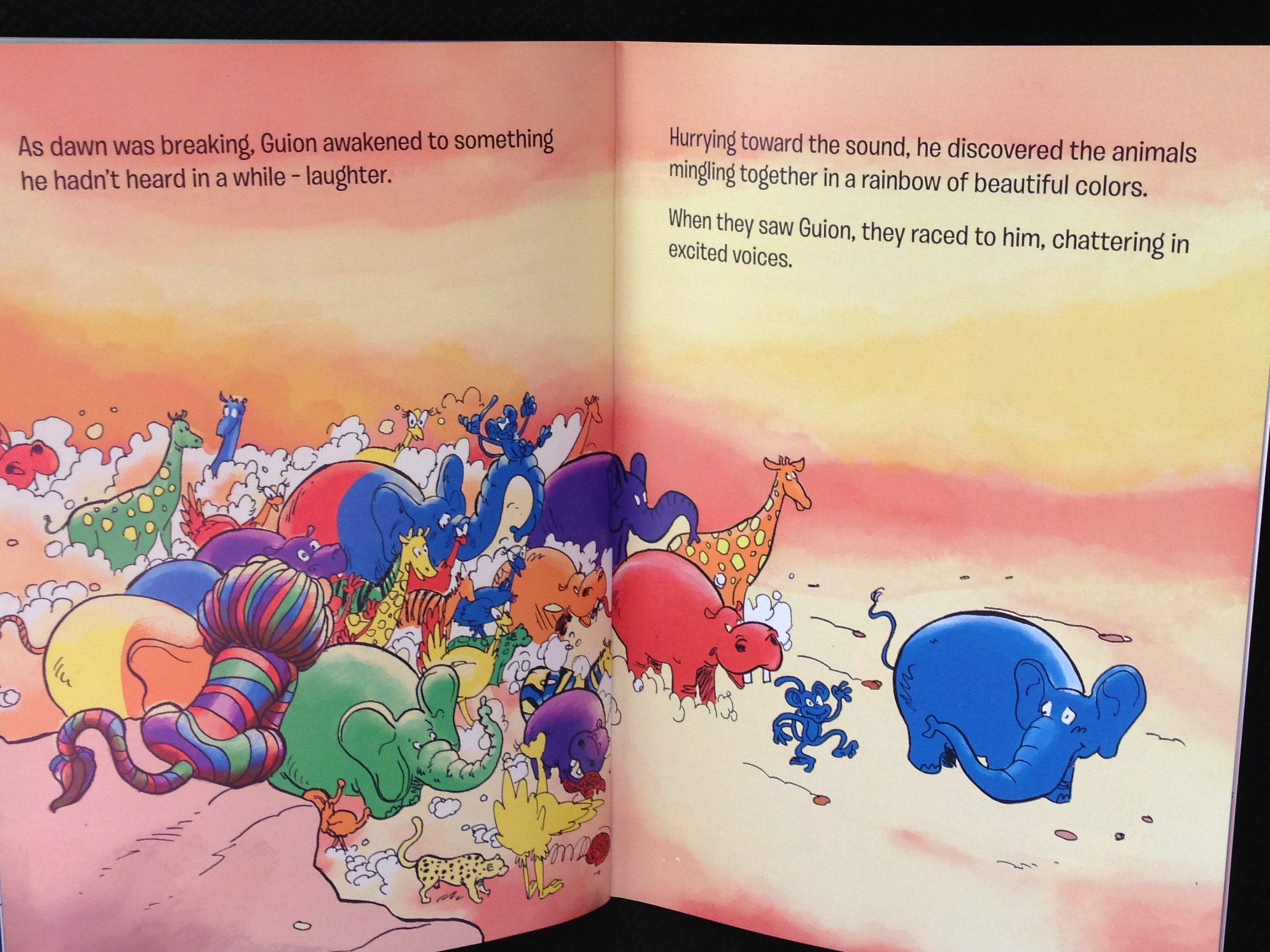 When Guion (rhymes with Lion), a colorful Lion, jumps into the terrain of the Savannah, he discovers something odd: color is missing! He tries to fix the bleak terrain by first painting a rock, but he cannot get the color to stick.