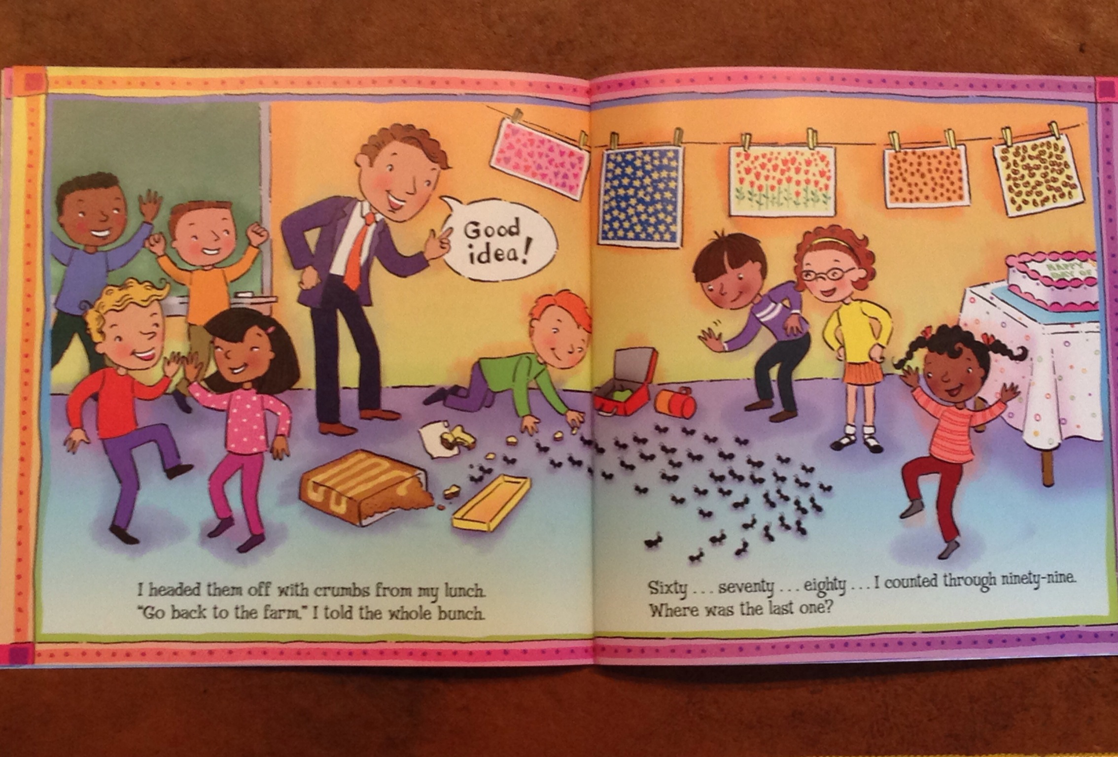 He waited patiently the next day in class while everyone had a turn during Share Time. Then he headed to the front of the room excitedly. Maybe a bit too eager, because he stepped on a marble and he and the ants went rolling! 100 ants spilled onto the classroom floor. He quickly put his lunch crumbs on the floor to direct the ants back to their farm instead of toward the celebration cake: