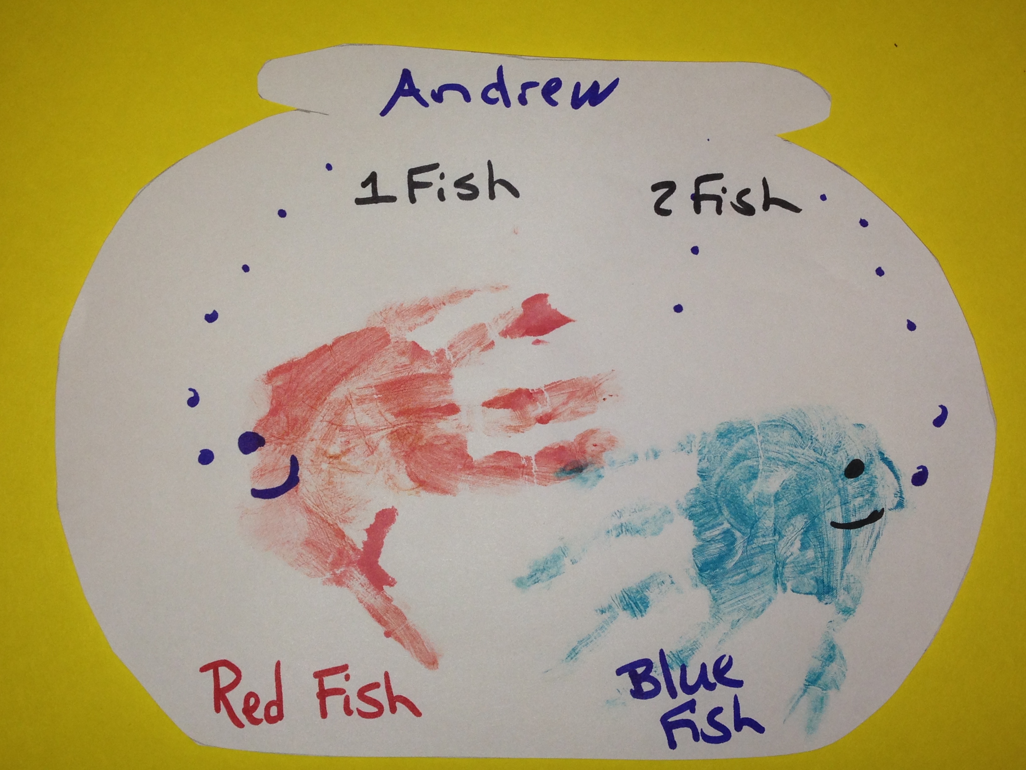 Fish Bowl with red and blue hand print fish